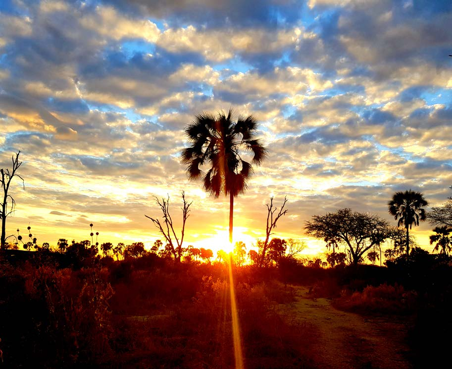 Gomoti Plains surrounded by vast open flood plains, marsh areas around the outskirts of the camp. The river sources being easily located by the soaring palm trees standing tall above the tree top canopy, which is a sign of water – life of the Delta.