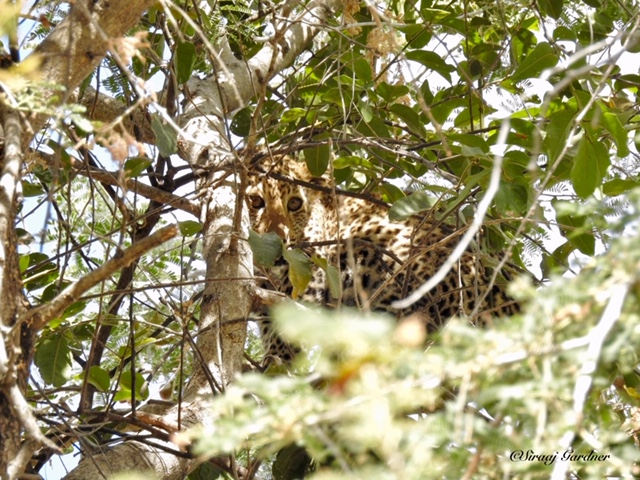 Suddenly a sharp growl coming from a cub in the next tree warned them off. Later that afternoon the cub was briefly spotted again, this time with the female adult leopard.