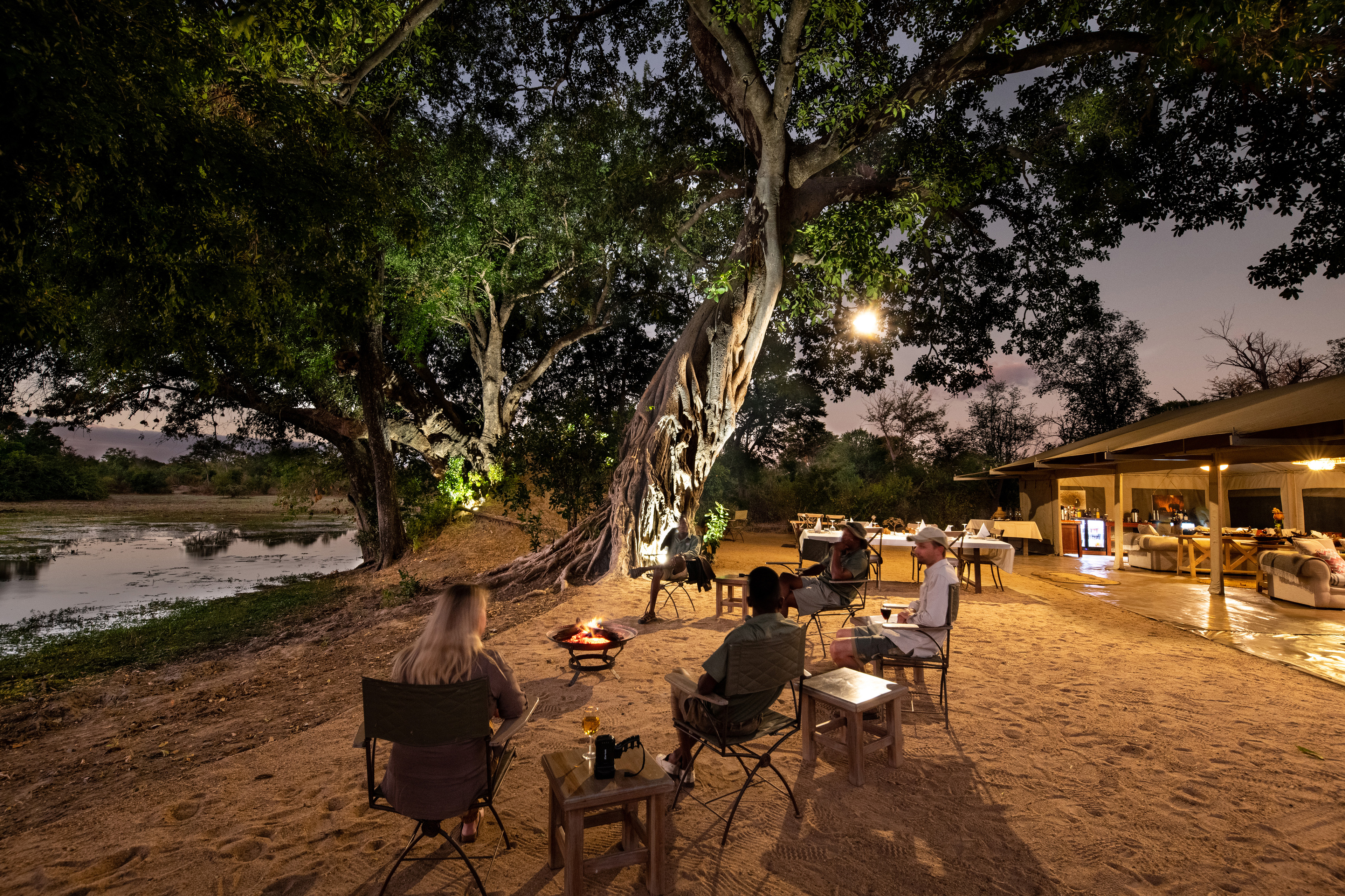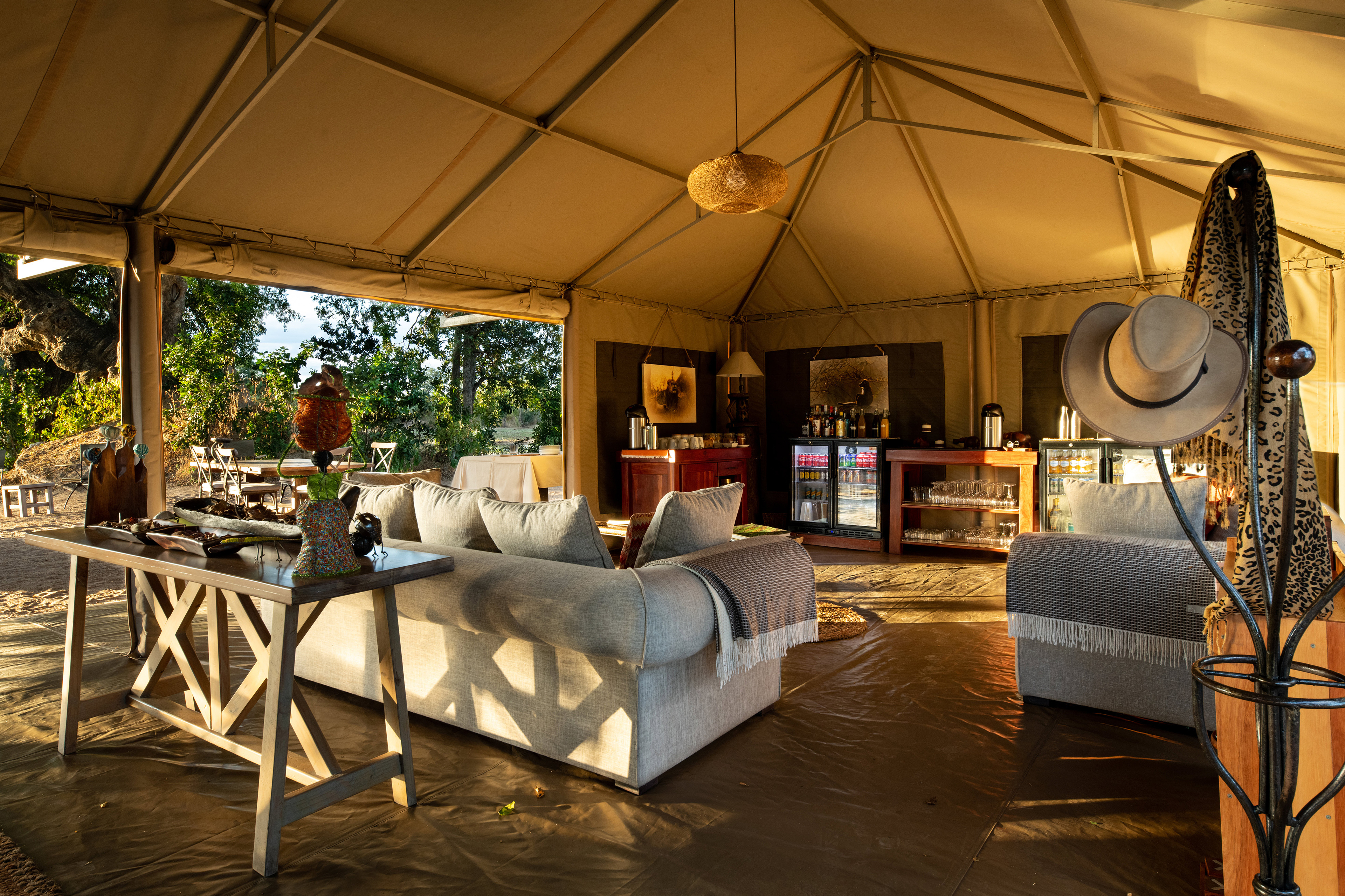 The oversized tented deck area forms the social hub of our camps. You can meet other safari goers at the bar, relax in the lounges or gather around the large fire pits to swap stories, fuelling the feeling of being on an authentic African safari in the bush.